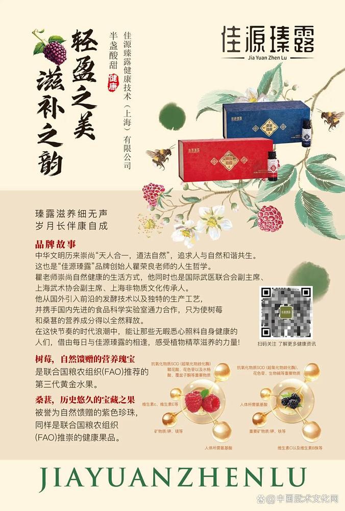 赛事还结合了健康养生理念,佳源瑧露作为赛事支持品牌,其创始人瞿荣良老师,将武术与健康养生完美结合。
