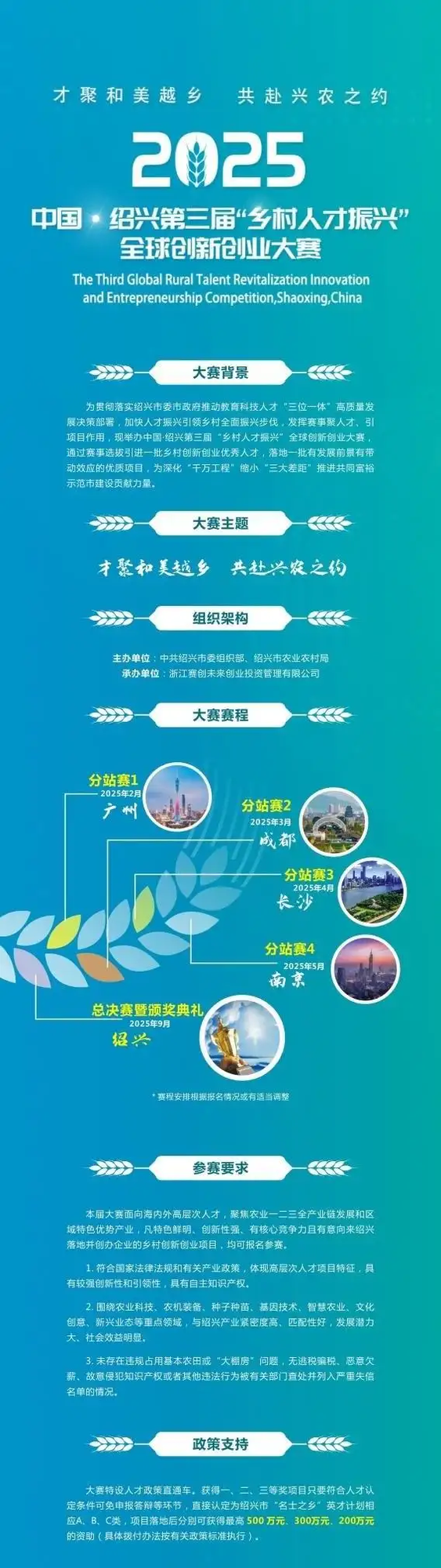 近日,中国・绍兴第三届 “乡村人才振兴” 全球创新创业大赛正式开启项目报名。此次大赛以 “才聚和美越乡 共赴兴农之约” 为主题,由中共绍兴市委组织部、绍兴市农业农村局主办,浙江赛创未来创业投资管理有限公司承办。大赛旨在贯彻绍兴市委市政府关于推动教育、科技、人才 “三位一体” 高质量发展的决策部署,通过发挥赛事在汇聚人才、引进项目方面的作用,加速人才振兴引领乡村全面振兴的进程,为深化 “千万工程”、缩小 “三大差距”,推进共同富裕示范市建设贡献力量。